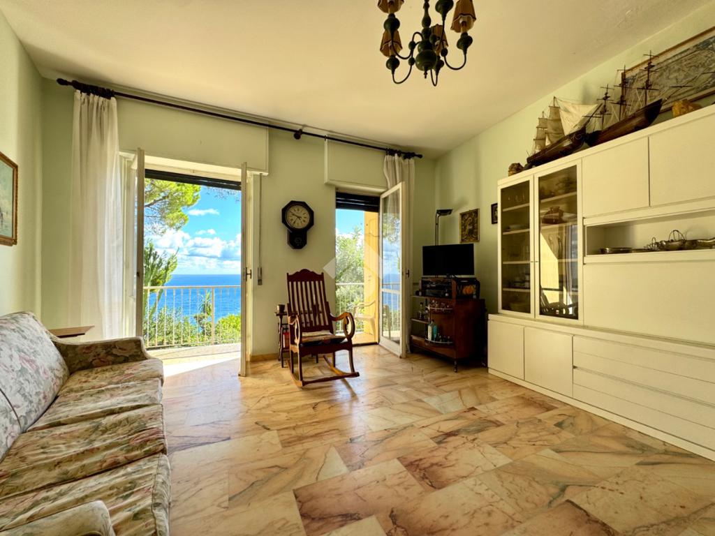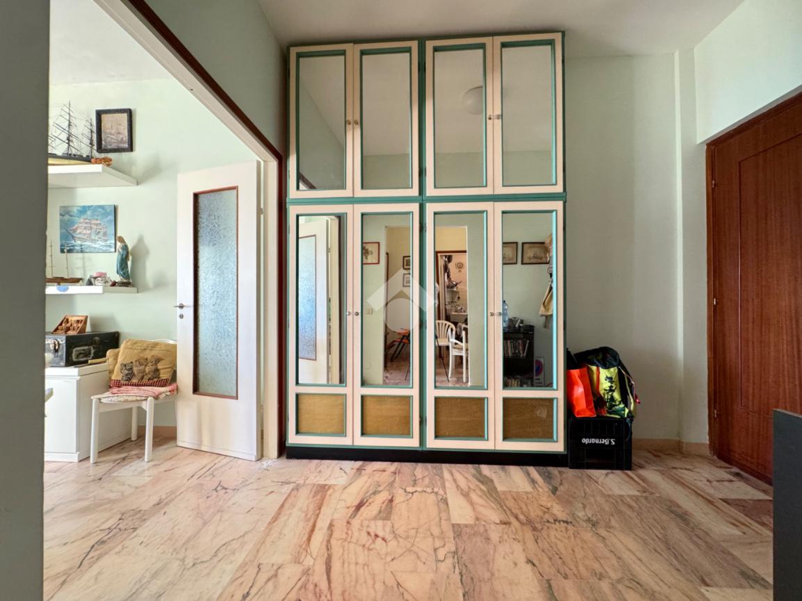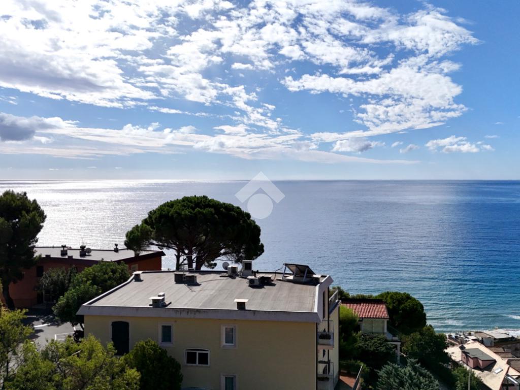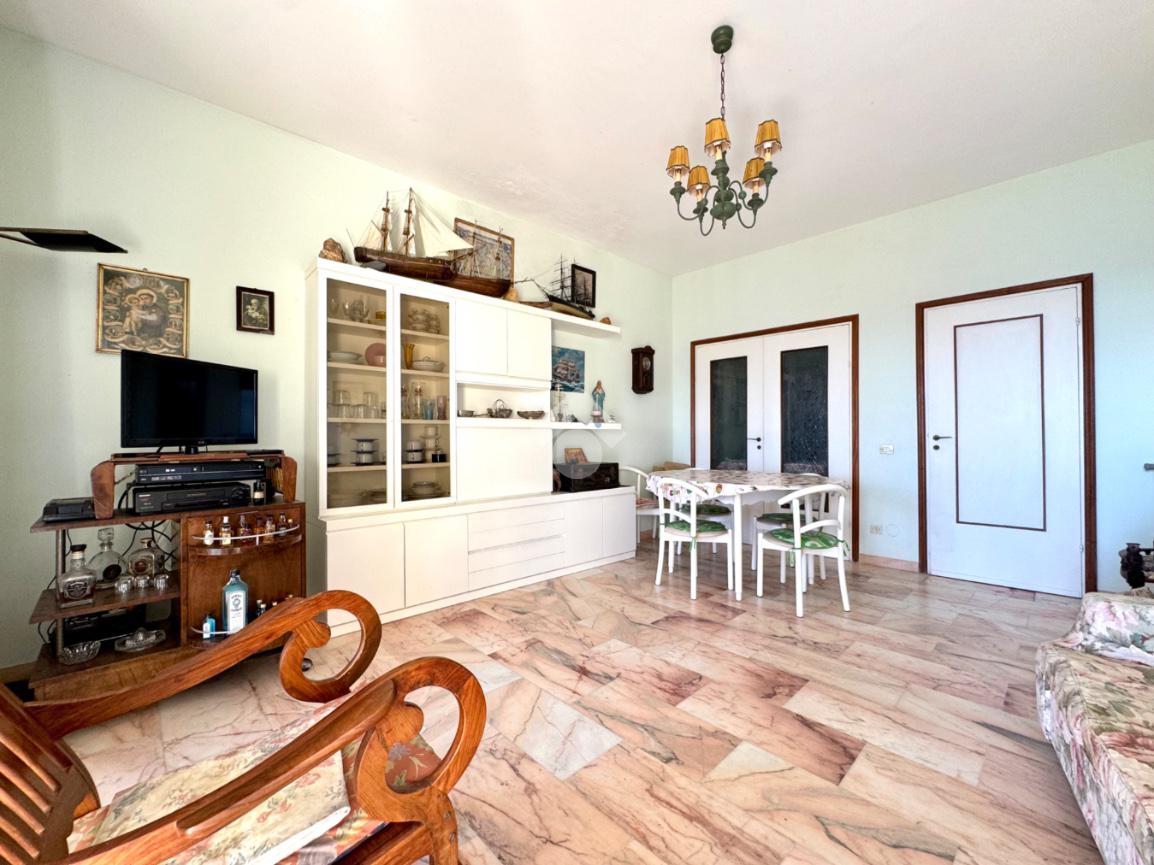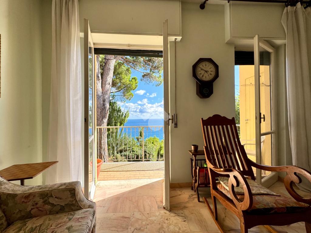 L’ingresso si apre su un ampio disimpegno che distribuisce in maniera funzionale gli ambienti interni. La zona giorno è composta da un salone luminoso con affaccio diretto sul mare e accesso al primo balcone, ideale per momenti di relax all’aperto. A seguire troviamo il cucinotto finestrato e un primo bagno con vasca e finestra. La zona notte offre una camera da letto, oltre a una camera matrimoniale con bagno privato e ulteriore accesso al secondo balcone, anch’esso con splendida vista sul mare. A completare la proprietà posto auto davanti allo stabile.