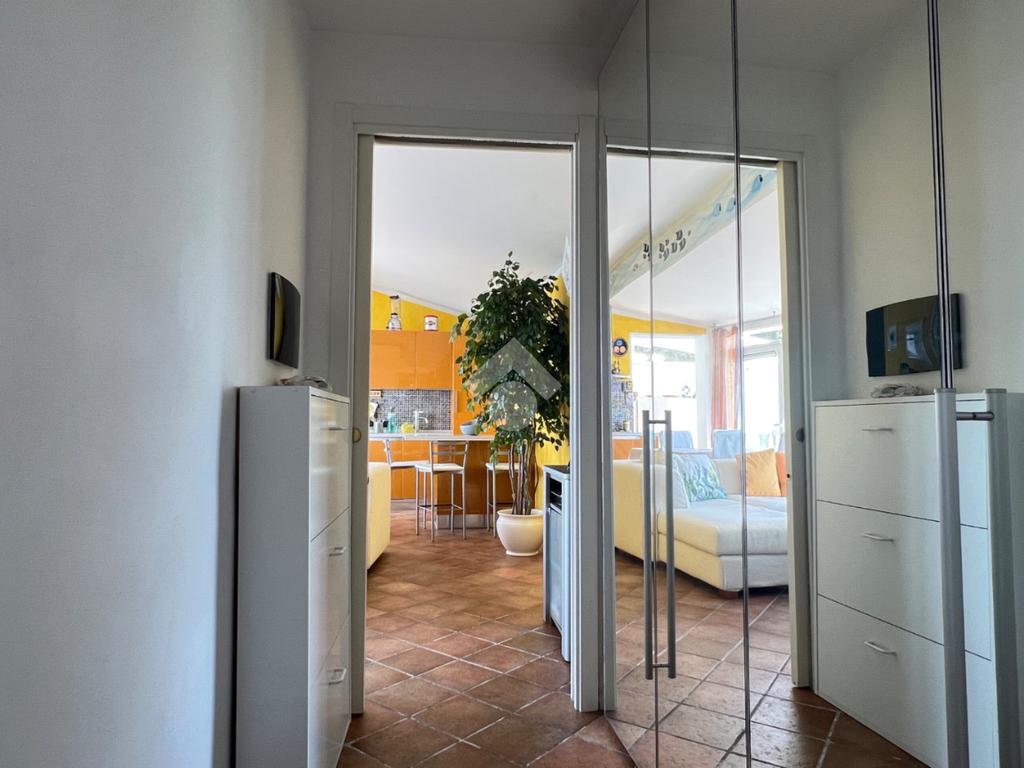 Internamente l’appartamento ospita un ampio living con cucina a vista, valorizzato da grandi vetrate panoramiche, camere da letto matrimoniale, bagno con box doccia e ripostiglio.