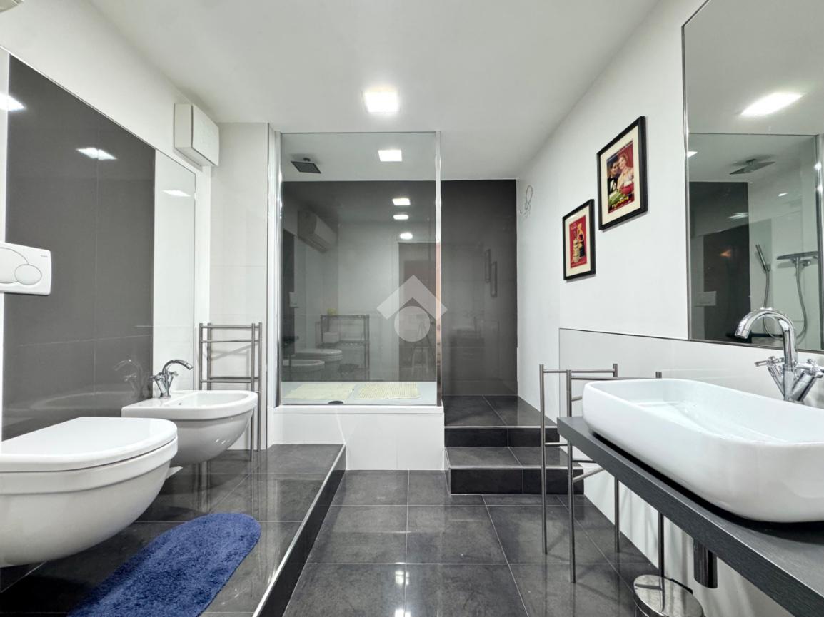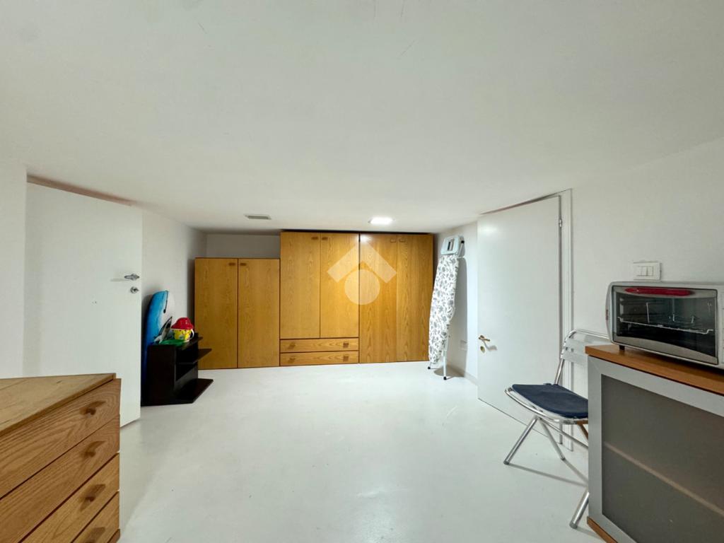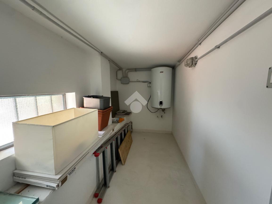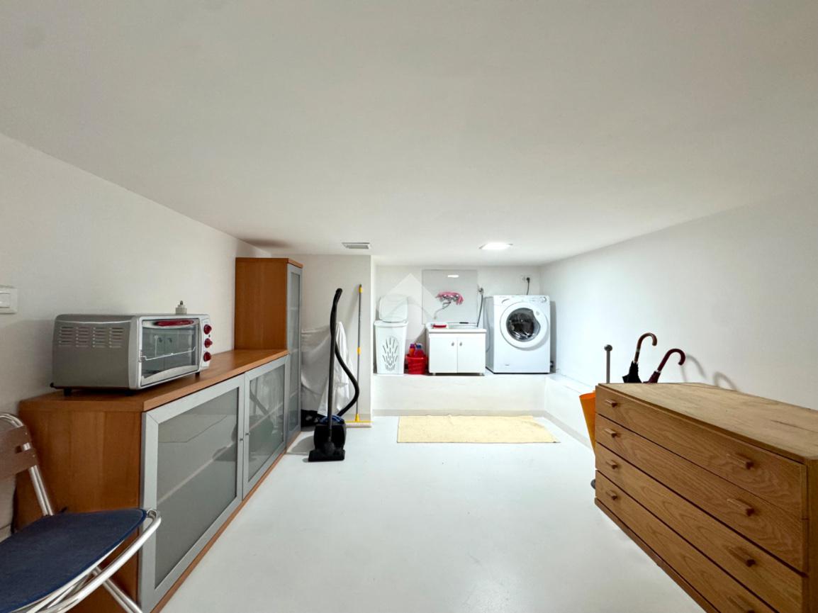 Scendendo le scale interne si accede alla zona servizi, dove troviamo un ampio bagno finestrato con box doccia doppio, oltre a una comoda lavanderia/magazzino, pratica e ben sfruttabile.